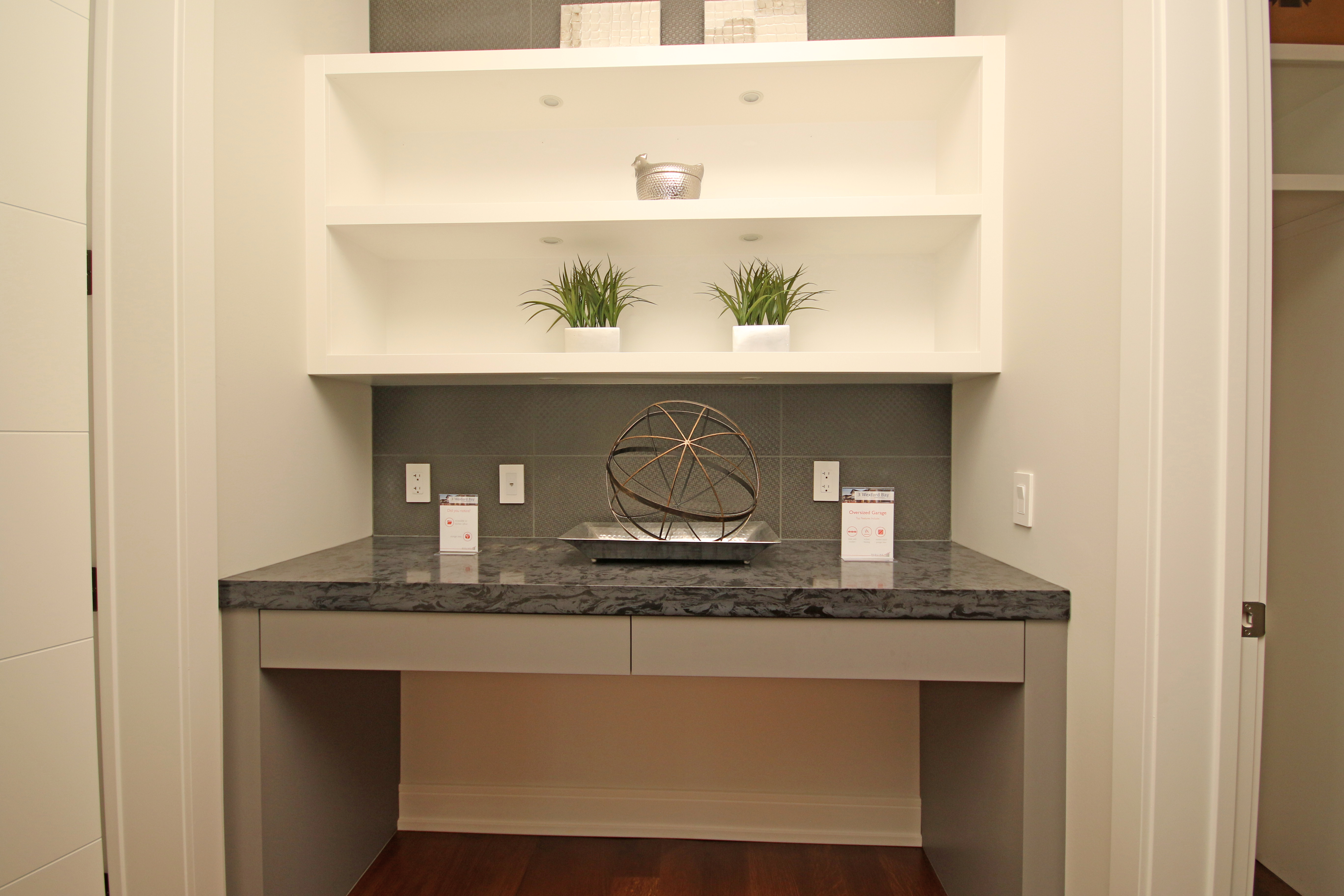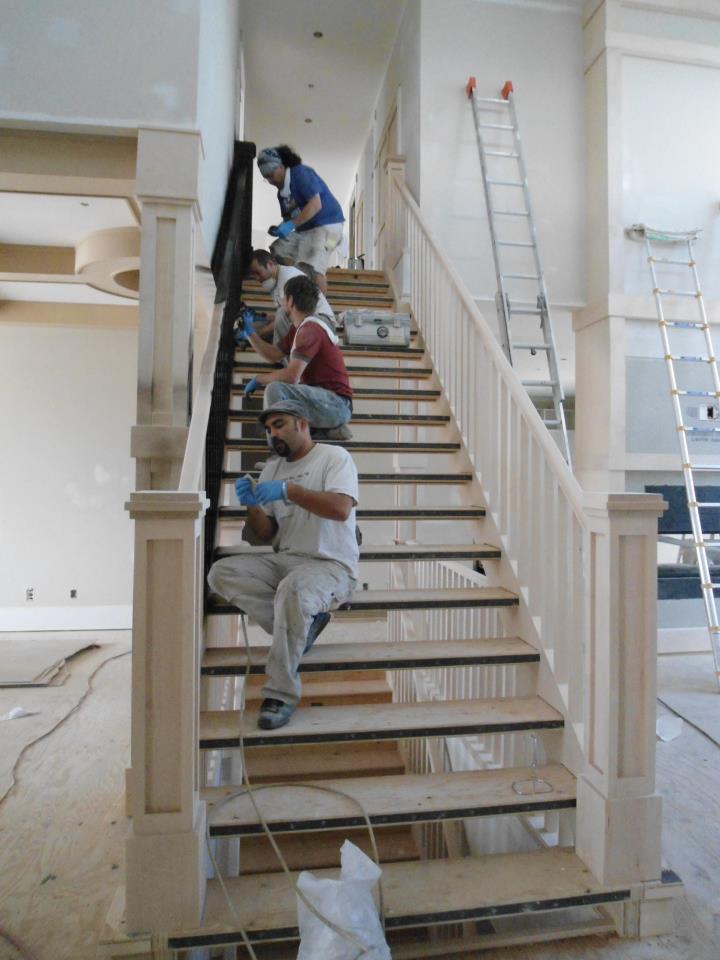 Built-ins painted Oxford White, Paper White walls by Johnny B's Painting Staircase painting with Teak on fir railing, Paper White walls, Oxford White casings by Johnny B's Painting Office Custom built ins and casings Oxford White, Walls Dior grey by Johnny B's Painting Bright open living room, walls painted paper white, trim oxfordwhite